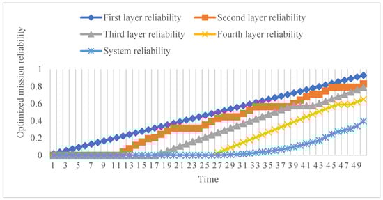 From Figure 6, the mission reliability of the information processing layer at t = 50 is 0.7966 and the mission reliability of the command post system is 0.2866. After optimization, the mission reliability of the information processing layer at t = 50 is 0.8317 and the mission reliability of the command post system is 0.3968. The mission reliability value of the information processing layer network is optimal. The mission reliability of optimized information processing layer and command post system is higher than that before optimization, so the solution proposed in this paper is correct.