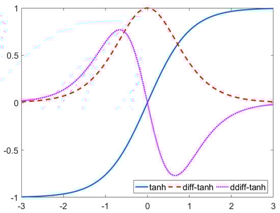Many experiments have shown that choosing a suitable activation function is crucial for DNNs in various fields. As we have learned, nonlinear activation functions such as , and are the common choice for the DNN model; they will improve the capacity of DNN to deal with various nonlinear problems, such as nonlinear PDEs and classification. Due to the biharmonic equation in this work being a class of high-order PDEs, an activation function with a low-order derivative possibly has an unfavourable effect for DNN when it is used to solve (1). We then consider the activation function with a good regularity, such as tanh. Figure 3 depicts the curves of the tanh function with first-order and second-order derivatives, which shows that the range of derivatives for tanh is small and stable.