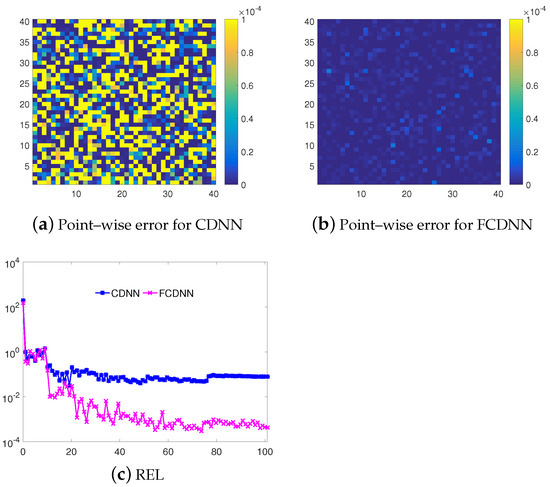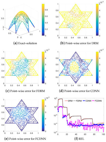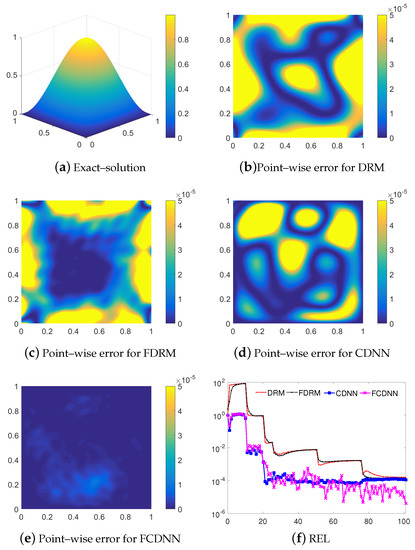 Based on the above results, we can see that the DRM, FDRM, CDNN and FCDNN are all able to approximate the solution of (1), in which, the FCDNN model performs best, and the performances of CDNN, DRM and FDRM are competitive. In terms of the overall errors, the CDNN is stable in all training processes, but the FCDNN is still descending with small oscillations. This means that the Fourier mapping activation function will improve the capability of the CDNN model. Table 1 shows that the CDNNs only cost approximately 0.5 h to solve Equation (1), but the DRMs cost more than 1.05 h. In summary, our CDNN methods not only have a high accuracy, but are also efficient.