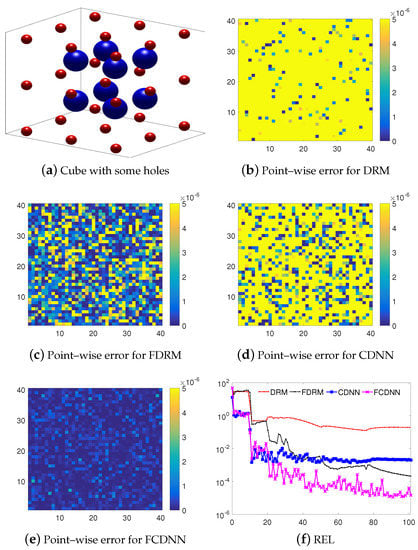 Based on the above results, we can see that the FCDNN still outperforms other models when solving the biharmonic problem (1) in a three-dimensional space, and that the performance of the CDNN becomes a bit weaker than the FDRM. In addition, the point-wise square error of the four models in Figure 6b,c, as well as the overall errors in Figure 6f, show that the performance of FCDNN is much better than that of the other three models. Compared with the case of 2D, the data in Table 3 show the run-time of CDNNs is almost kept unchanged, but the DRMs will cost more time.