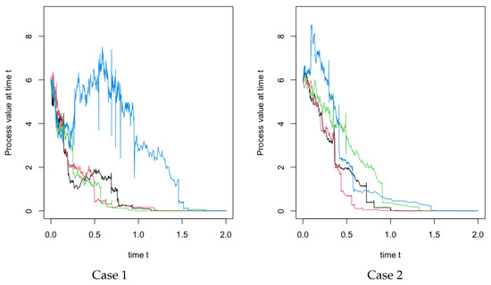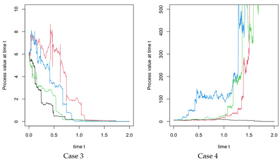 Figure 1 and Figure 2 provide graphical representations of the simulated trajectories for each case. The expectation and variance of the jump amplitudes were and , respectively. The probability of a negative amplitude was in accordance with Equation (5). These figures illustrate the convergence results given by Theorem 2, namely that in cases 1 to 3, we had convergence of the expected process, and divergence of this process in case 4.
