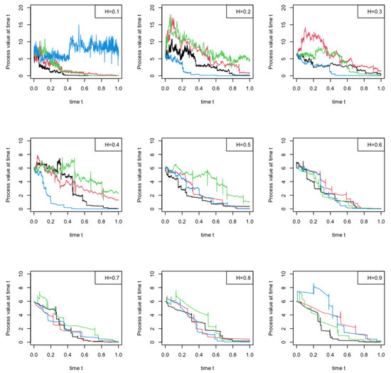 In order to simulate given by Equation (6), it is first necessary to simulate the fBm. Different methods have been discussed in the literature to simulate fBm trajectories [23,24]. Thus, the packages and have been available with the software environment for statistical computing and graphics