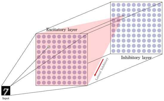 SNN can be divided into two types: supervised [] and unsupervised [,] according to the learning method. While the supervised SNN learns with a designated label on each neuron, the unsupervised SNN, as shown in Figure 1, studies the input data by itself without a selected tag on each neuron. The unsupervised SNNs are receiving great attention from both academia and industry due to the characteristic of their learning mechanism being closer to synaptic learning in our brains [,,]. Therefore, this paper also focuses on research on the unsupervised SNN.