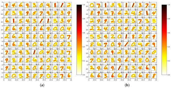 To this end, we first fixed at V, such as previous work [], and then conducted an experiment, observing that the learning of the winner-take-all (WTA) rule was applied to more than two number of neurons, i.e., input data of the same shape is learned by multiple neurons. To increase training efficiency and reduce power consumption, we then increased to 0.2 V and 0.25 V, which shows that in 0.2 V, the most firing neurons are still more than two, but in 0.25 V, the number is one. In other words, in 0.25 V, only one neuron can fire, so the number of spikes is reduced, and each neuron can have its own data. Therefore, neurons can react more effectively, as they respond to matched data with neuron’s own data if they are stimulated by input spikes. As a consequence, we have set to V, as reported in Table 2.
