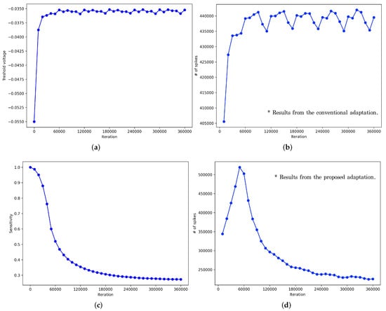 Next, we analyzed the number of spikes fired according to the iteration change. First, through Figure 4b, we can see that the number of spikes fired increases dramatically from the 10,000th iteration. This is because the decrease in the number of firing spikes in the neural network, which can be expected through an increase in , becomes slower as the adaptation is almost completed at around the 10,000th iteration, whereas, since the training of the neural network has not yet been completed, the weights grow in value through learning until the 60,000th iteration required to learn all the training data afterwards, which can be interpreted as affecting the increase in the number of spikes fired. On the other hand, looking at Figure 4d), we can observe that the number of the firing spikes in the neural network steadily increase until about the 50,000th iteration for the sensory adaptation, and then decrease from about the 60,000th iteration. From this, we can estimate that by the 60,000th iteration, growing weights through learning has a decisive effect on the number of spikes fired change, and then the number of spikes decreases by replacing the role.