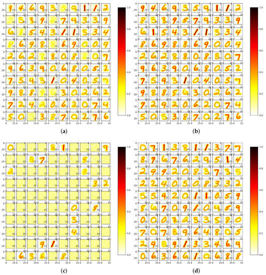 Analyzing the number of spikes according to the NOI, we faced the question of whether the point at which the learning of the sensory adaptation is completed was slower than the conventional variation-based adaptation. To answer this question, we first look at Figure 5a,c, which show the 10,000th learning result to which the conventional and proposed adaptations are applied, respectively. It can be confirmed that there are neurons that have not yet been trained, and it can be seen that there are more untrained neurons in the result of the proposed method. This might make us doubt that the question was true, but fortunately, if taking a look at the results when all the training data have been trained (at 60,000th) shown in Figure 5b,d, we can confirm that it is not. That is, as can be seen from Figure 5d, in the simulation to which the proposed adaptation is applied, when learning is completed, all neurons are correctly mapped as shown in Figure 5b. In other words, we confirm that the sensory adaptation also shows the same result as the learning rate of the conventional adaptation. In addition, comparing Figure 3a vs. Figure 5b, and Figure 3b vs. Figure 5d, respectively, shows that the numbers in the results at the 180,000th iteration have a darker color overall compared to the corresponding numbers in the results at the 60,000th iteration. This may be because, in the learning after 60,000th, weight tuning is performed for detailed responses of neurons to input data rather than learning for data/label mapping.