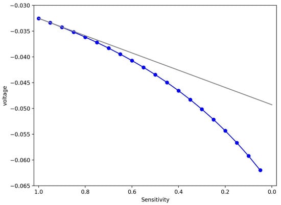 In addition, we can identify this phenomenon in the change of the neuron’s steady state voltage due to change. In Figure 8, the neuron’s steady state voltage is more changed depending on the decline of , similar to the blue line in Figure 6b. Since the steady state voltage depends on change, the inclination of the change of the steady state voltage affects in (20), which is the inclination. Therefore, the steady state voltage can also explain why the total spikes reduction happens.