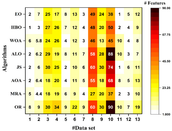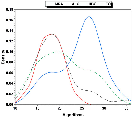 The feature selection distributions of the selected algorithms (MRA, ALO, HBO, and EO) are presented in Figure 4. MRA shows the most uniform distribution curve for the density of selected features than other compared algorithms while keeping the lower number of features (less than 30) through different iterations. The HBO algorithm shows the highest density of selected features with non-uniform curve, so it will be removed from the next comparison.