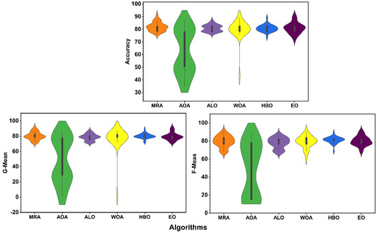 The violin plots illustrated in Figure 3 show the ACC, G-Mean, and F-Meas for the proposed MRA method and all compared methods. A violin plot is a hybrid of box and kernel density plots, which presents peaks in the data. These plots are commonly used to visualize the numerical data distribution and show summary statistics with the density of each variable. The distribution shape is extremely wide in the middle and skinny at the two ends for the MRA, ALO, HBO, and EO methods for the three used measures. In addition, ACC, G-Mean, and F-Meas for the MRA method are highly concentrated around the median, which directly indicates that the MRA algorithm occupies the first order in achieving the best performance in terms of ACC, G-Mean, and F-Meas and is then followed by HBO, EO, and ALO.