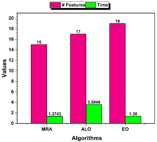Figure 5 presents the bar chart for the selected feature numbers and time measures of the selected algorithms. Regarding the number of selected features, the proposed MRA shows the lowest number and is first in the order of the three selected algorithms. The ALO algorithm comes after the MRA in comparing the number of selected features, while the EO algorithm holds the last order in the comparison.