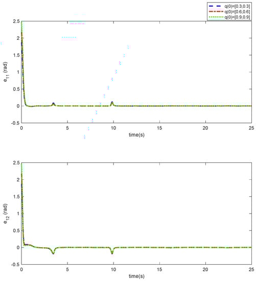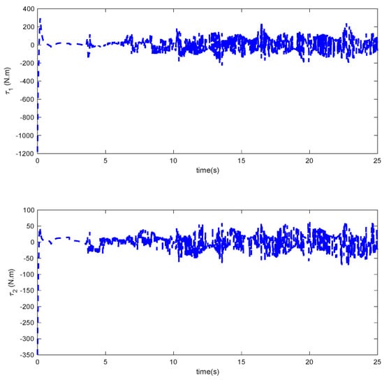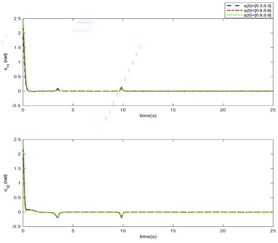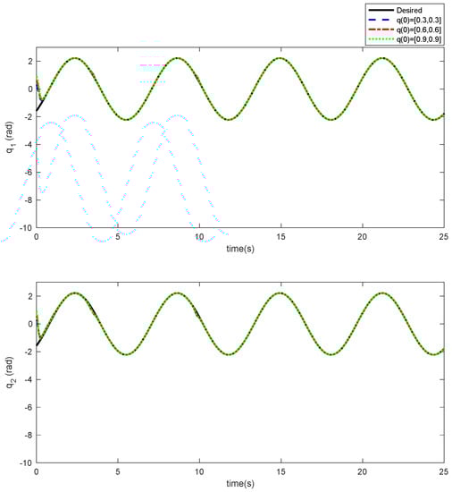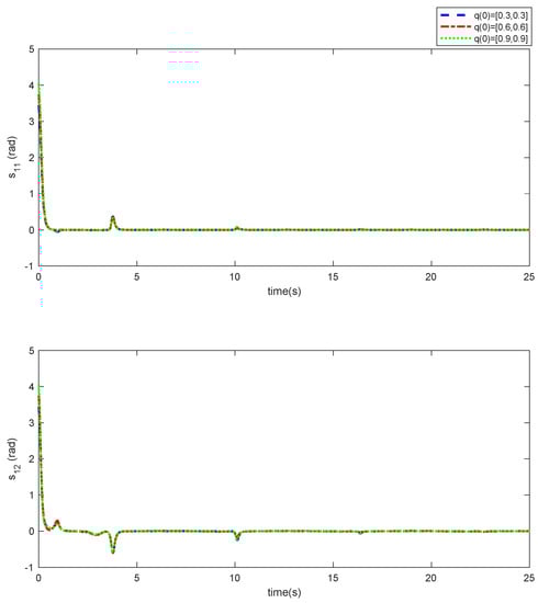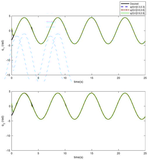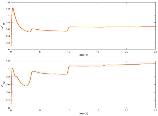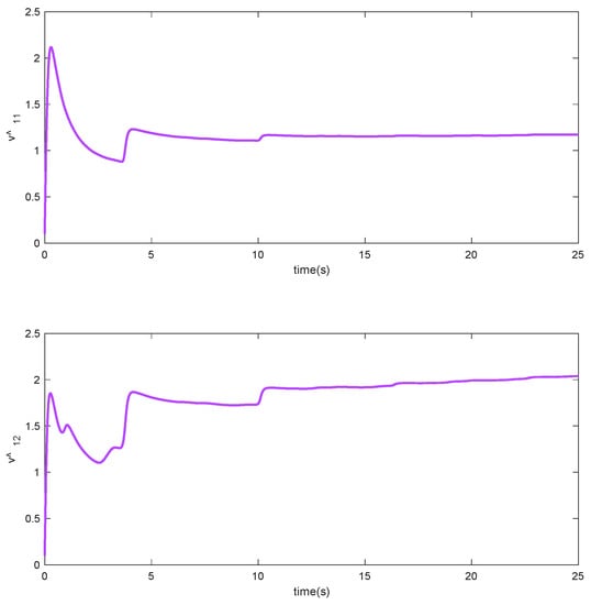 As it can be observed, the simulation results based on the Scenarios 1 and 2 are provided in Figure 2, Figure 3, Figure 4, Figure 5, Figure 6, Figure 7, Figure 8, Figure 9, Figure 10, Figure 11, Figure 12 and Figure 13. The desired tracking of the upper-limb exoskeleton robot system based on Scenario 1 and Scenario 2 is depicted in Figure 2 and Figure 8. As one can observe, the upper limb exoskeleton robot system tracks as desired, completely. The trajectories of the tracking error based on Scenario 1 and Scenario 2 are illustrated in Figure 3 and Figure 9, respectively. From these figures, we can observe the that desired tracking has been performed accurately. Moreover, the sliding surfaces based on Scenario 1 and Scenario 2 are displayed in Figure 4 and Figure 10, respectively, and it is obvious that the sliding surfaces converge to zero eventually. From the figures related to the desired tracking, tracking error, and sliding surface, it can be found that under different initial conditions, the proposed control method is robust and offers an acceptable performance. Additionally, the control inputs, which are obtained based on Scenarios 1 and 2, are shown in Figure 5 and Figure 11, respectively. Lastly, the adaptation laws based on the neural network are displayed in Figure 6, Figure 7, Figure 12 and Figure 13. As one can observe, the approximation of the upper bounds of the model uncertainty and external disturbance are accomplished appropriately. Therefore, from the simulation results, we can observe that the designed method proposes a robust and productive performance under different initial conditions, a diverse model uncertainty and external disturbance, and various desired values.