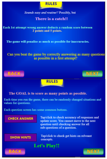 Figure 1 shows two screenshots from the game to clarify the game’s design and interface. Notably, while the question type and context are different, the interface was kept consistent across screens. The interface has a minimalist design, shows the game’s state, such as the question being answered and the score, and points to documentation. Further, Figure 2, through two different screenshots, describes the way the game calculates points and handles erroneous situations. Finally, Figure 3 shows screens indicating the game’s rules and the fun part of beating the game by trying to answer most questions correctly. Detailed documentation of the game and the way to answer the questions were also provided to students.