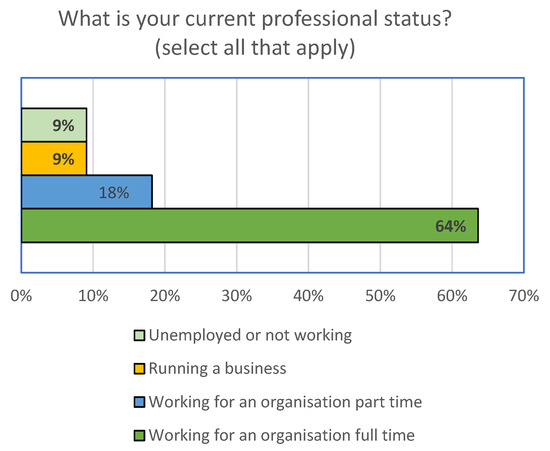 Professionally, respondents primarily worked for an organisation full time (Figure 7).