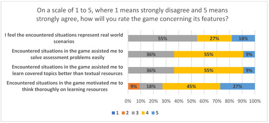Through its questions within a quiz-like environment, the developed game assesses students’ ability to reflect critically and make investment decisions within some contexts. Thus, the survey also queries how students perceive the encountered situations, i.e., game content. Noticeably, although the game attempted to model some real-world situations, the rating concerning this was primarily neutral (Figure 13). However, most respondents deemed GBL better than textual resources and felt it assisted them with assignments (Figure 13). Further, many respondents agreed that the situations bolstered their critical thinking and engagement with the contents (Figure 13).