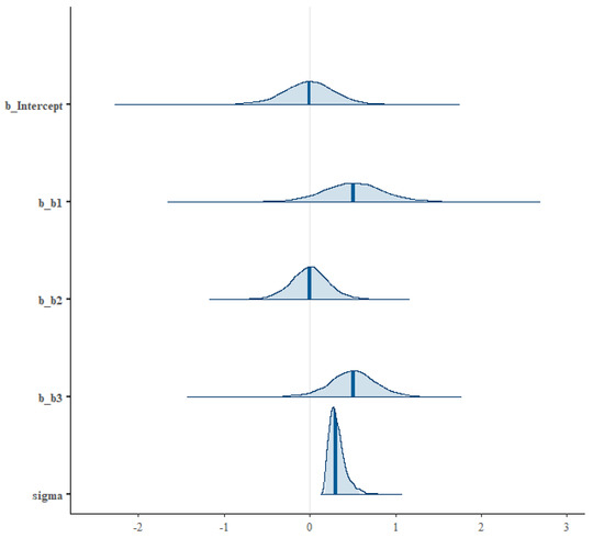 Density plot of the fitted regression model, generated using the brms R package [53,54,55]. The coefficients are labelled with a prefix “b_”; this is due to auto generation by the relevant R function. b_intercept corresponds to ; and b_b1, b_b2 and b_b3, respectively, correspond to , . and of the model. The shaded blue area indicates the 95% credibility interval.