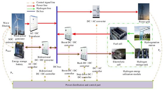 In Formula (1), represents the DC bus capacitance (F); is DC bus voltage (V); and , , , and are the currents (A) of PMSG, Bat, FC, and EL, respectively. The system monitors the real-time parameters of each subsystem, allocates power, and operates the control part, so as to judge the current system in real-time and obtain the control signals of each subsystem [15]. When the converter receives the control signal, it assists the system in power distribution to ensure the controllability of the grid-connected power and effectively improve the penetration performance of wind energy.