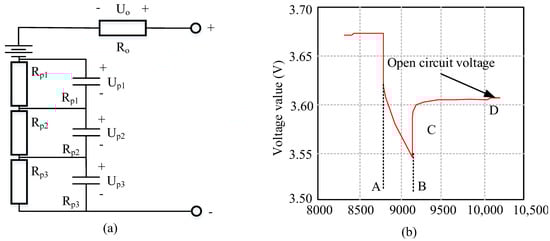 In Formula (4), is the sampling time, is the rated capacity of the battery, is the observation noise, and is the system noise, where I in the system noise can be 1–4. The battery data is mostly completed under a different battery state of charge (State of charge, SOC) [16]. Therefore, in order to accurately identify the parameters of different models, the Ultimate Tensile Strength (UTS) sub-capacity cabinet was used for research and analysis; the object was a 3.2 Ah 18,650 lithium battery at a room temperature of 25 °C. The third order Thevenin model is used to analyze the constant current charge and discharge parameters. The model design is shown in Figure 2. Wherein, Figure 2a is the third-order Thevenin model, and Figure 2b is the sampling point diagram of the complete pulse discharge process.