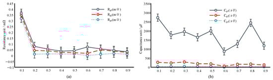 Figure 3a shows the polarization resistance of RC link, and Figure 3b shows the polarization capacitance of RC link. Formula (9) is used as the parameter fitting calculation formula for the function relationship between and BMS; finally the polarization resistance and capacitance of the RC link under the third order Thevenin model of the constant current charge-discharge experiment can be obtained. From the above Figure 3a,b, the polarization resistance and capacitance of the RC link under the third order Thevenin model are relatively stable from 0.1 to 0.9. However, the polarization resistance is relatively stable between 0.1 and 0.9, while the polarization capacitance has a relatively large variation in this area. The reason is that the capacitor is a series-mixed structure, which is affected by factors such as leakage and breakdown. It leads to the abnormality of the equivalent circuit and increases the capacitance loss [18]. In addition, the resistance value of capacitor and DC is infinite, so when leakage or breakdown occur, the DC resistance will decrease.