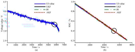 First, the estimated and reference values of battery terminal voltage and SOC are analyzed, as shown in Figure 5. Wherein, Figure 5a shows the estimated value and reference value of battery terminal voltage, and Figure 5b shows the estimated value and reference value of SOC. Under the influence of noise, the accuracy of the voltage prediction values under the above three algorithms during battery operation fluctuates slightly. The estimated value of the improved AUKF algorithm is very close to the estimated value of the UKF algorithm and is relatively far from the estimated value of the PF algorithm, suggesting that the BMS estimation model based on the improved AUKF algorithm is more accurate. From the perspective of SOC estimation, compared with the UKF algorithm and PF algorithm, the improved AUKF algorithm has higher prediction accuracy for SOC estimation.