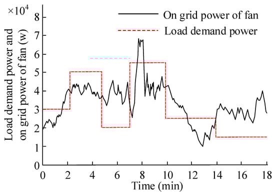 A separate grid-connected simulation is carried out through the fan parameters. The grid load demand power and grid-connected power are shown in Figure 6. It can be seen from Figure 6 that there is a big difference between the power demanded by the grid load and the grid-connected power. Additionally, the requirements for the system distribution control performance are high. These two curves can judge the stability and security of the system effectively. In 0–2.0 min, 2.2–4.6 min, 11.7–14.1 min, and some other time periods, high-power loads were put into use without energy storage equipment, and the phenomenon of power shortage occurred. At 7.1–8.2 min, the wind speed changed greatly but the load power did not fluctuate. At this time, there was a large residual power in the system. After 13.9 min, the system load demand is less, and there is also a large residual power. Therefore, load changes and sudden changes in wind speed seriously affect the stability of the system power, resulting in unstable operation of the power grid. When the wind turbine is connected to the grid alone, the tracking results of parameters such as dq-axis current and torque show that the wind turbine has a better operation effect.
