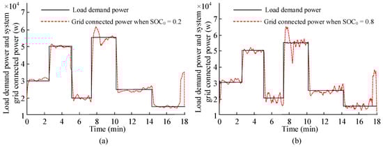 When the same load demand and wind speed are the same, the grid-connected power of the system after the hydrogen energy device is added to the system as Figure 7. Wherein, Figure 7a shows SOC0 are 0.2 and Figure 7b shows SOC0 are 0.8. The battery only needs to bear the fluctuating power of AUKF and does not compensate the delay strategy of FC and EL. When the values of SOC0 are 0.2 and 0.8, the grid-connected power of the system is much smaller than the individual grid-connected power of the fans. When the value of SOC0 is 0.8, the stability of grid-connected power is poor, mainly because the system discharge and battery capacity are limited, so that the system absorbs less fluctuating power, thus improving the instability of grid connected power (>0.2). Usually, the system is affected by the pressure of the hydrogen storage tank and the response delay of the hydrogen energy storage, so that the grid-connected power of the system is continuously affected. From the results in Figure 7, it can be seen that the difference between the on-grid power of the wind turbine and the load demand of the grid can be effectively compensated by the battery, and the delay characteristic causes that when the SOC0 is 0.8 and 0.2, there are surplus power (7.1min) and shortage power (7.9min) respectively, reflecting the weak ability of EL and FC to respond to changes in wind speed.