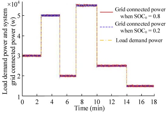 To verify the ability of the adaptive UKF power allocation strategy, this section establishes the above system model based on the MATLAB/simulink platform. The simulation uses the real wind speed data and average load data of a wind farm. In the same simulation environment, the grid-connected power time curve of the system is shown in Figure 8. The results show that, when the SOC0 is 0.8 and 0.2, the system can continuously and stably track the load demand of the grid connected power, so that the system operates in dynamic balance. Additionally, the power distribution meets the load demand of the grid connected power, with strong stability, which is better than the independent hydrogen storage system.