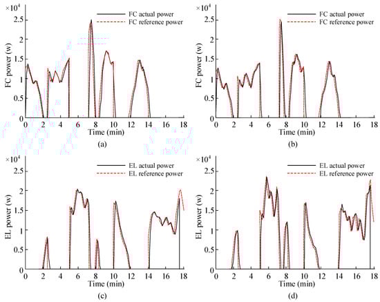 The FC and EL power change curves in the whole simulation time period are shown in Figure 9. Wherein, Figure 9a shows FC SOC0 are 0.2, Figure 9b shows FC SOC0 are 0.8, Figure 9c shows EL SOC0 are 0.2, Figure 9d shows EL SOC0 are 0.8. In Figure 9a, when the SOC0 is 0.2, the FC start-up is lower than the required time limit. The fuel cell is operated at 0 min, 2.49 min, 7.21 min, etc. Due to the large density of hydrogen, the throughput time of the power grid is extended, so that the FC delays. In Figure 9b, when the SOC0 is 0.8, the fuel cell is operated at 0 min, 2.49 min, 7.21 min, etc., and the SOC is high; the battery needs to bear more power shortage to reduce the SOC. So, FC is burdened with lower vacancy power. Within 2 min after the system is running, the battery power is lower than Figure 9a and the slope is too large. Figure 9a is consistent with the highest power in Figure 9b, indicating that the system is in a safe operating state when the system is operating to an intermediate period. In Figure 9c, when the SOC0 is 0.2, at 1.95 min, 5.04 min, 7.89 min, etc., there is residual power in the system. The electrolytic cell cannot track in real time, resulting in unbalanced power. At 17.4–18.1 min, the pressure of the hydrogen storage tank is the highest and the EL return delay is delayed. In Figure 9d, when the SOC0 is 0.8, the power absorbed by the battery is relatively low, so the power burden of the electrolytic cell is relatively large during this period. When SOC0 is 0.8, the electrolytic cell has been put into operation for 1.8 min, which is affected by the fuel cell operation delay. At this time, the EL power increases from 0 to 1.02 kW, which is higher than the corresponding position (0.84 kw) in Figure 9c. At the same time, the power values are higher than the corresponding position power in Figure 9c at 5.8 min, 7.8 min, 10.0 min, and 13.9 min. The change of electrolytic cell power at other times is affected by SOC and bus voltage state.