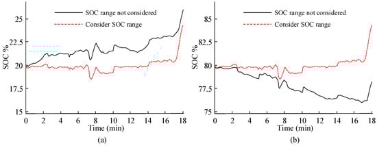 The SOC curve of the energy storage battery changes, as shown in Figure 10. Wherein, Figure 10a shows SOC0 are 0.2, Figure 10b shows SOC0 are 0.8. When the SOC0 is 0.2, the battery is charged and discharged only through the system’s remaining and lacking power. The overdischarge phenomenon occurs in 7.2–10.3 min, when SOC is 0.179. After adopting the security strategy, the SOC value remains above 0.2. When the SOC0 is 0.8, the battery is at the upper limit critical value, the SOC rises rapidly, and the SOC value reaches 0.85 after 18 min. After adjustment by the security policy, the SOC value remains below 0.8.