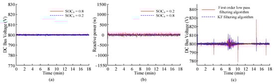Then, the influence of the method proposed in this study on the DC bus voltage of the system is analyzed, as shown in Figure 11. Wherein, Figure 11a represents the change curve of DC bus, Figure 11b represents the change curve of reactive power, and Figure 11c represents the change of DC bus under different algorithms. The results show that under the action of the PI controller, the DC bus voltage and reactive power curves are basically consistent with the reference values. When the SOC0 is 0.8 and 0.2 and the wind speed changes greatly, the DC bus voltage of the system can be stabilized at 800 V, which has strong stability, reflecting that the proposed distribution strategy can slow down the overcharge and discharge of the battery and also stabilize the voltage of the DC bus. Figure 11c shows the voltage curve of the DC bus obtained by different algorithms. The stability in the period of 7.1–9.7 min is small. Therefore, if the adaptive control method is not used, the performance of the KF filter and the first-order low-pass filter algorithm is poor. This leads to the large fluctuation of the DC bus, which has a great impact on the safe operation of the power grid.