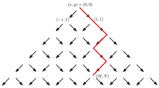 Let be the set of unrestricted paths from A to B on lattice with the steps . An example of such a path is given in Figure 1.