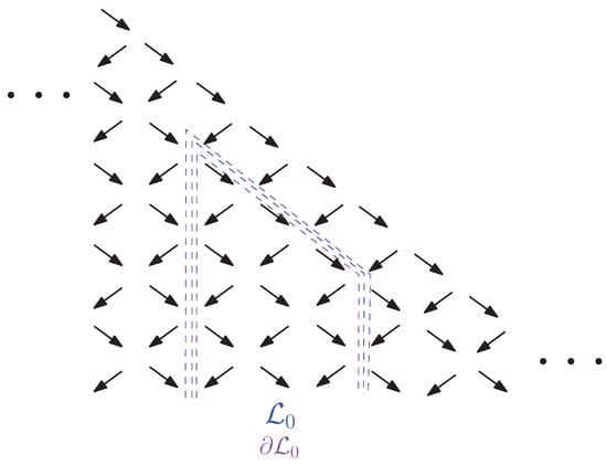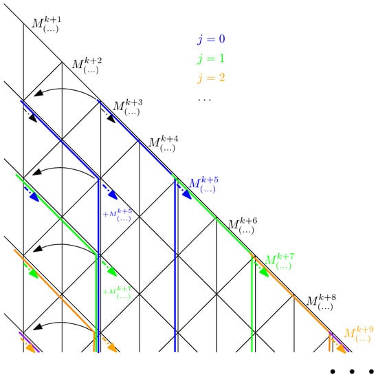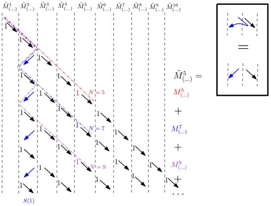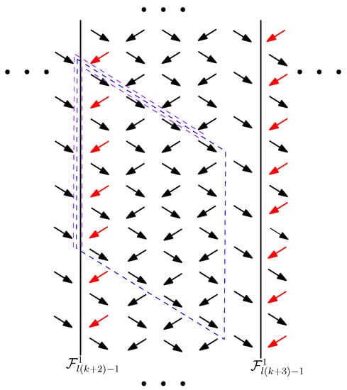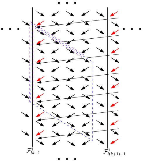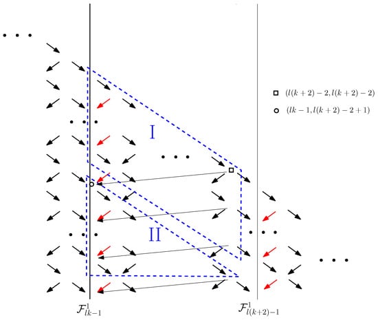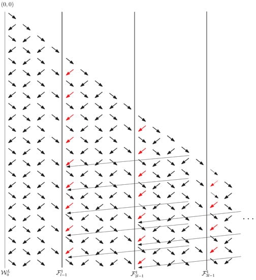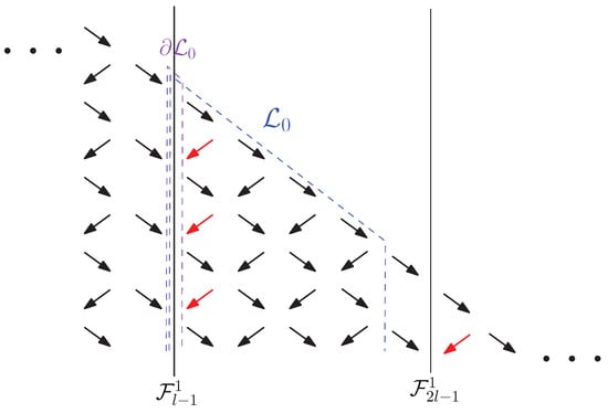 Blue arrows correspond to steps in the recursion on the coefficients, which were added as a consequence of the presence of long steps . In the black frame, it is noted that although long steps have length , as shown, for example, in Figure 12, their source and target points belong to two adjacent strips, so when dealing with the coefficients it is convenient to denote blue arrows as in the Figure 13. Long steps, following the idea of the proof of Formula (22) depicted in Figure 9, induce paths that descend further, giving the result as in Corollary 3. Similarly, blue arrows induce paths in the lattice, which descend further, adding new terms in (32).