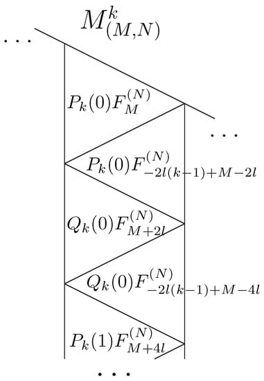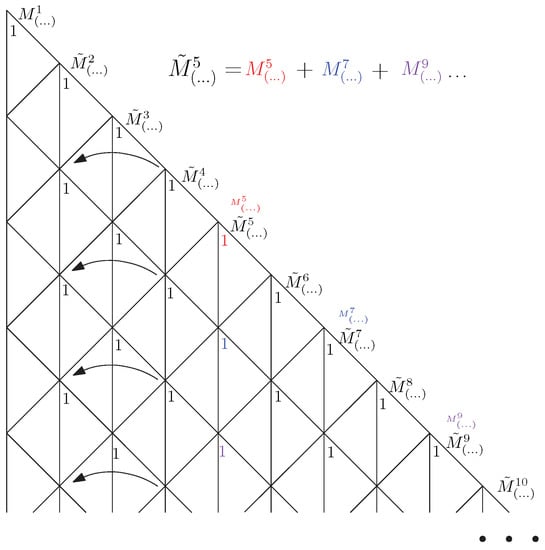 Now, our main goal is to apply for other k. As the considerations above suggest, applying for induces other sequences of blue arrows. From Figure 14, we see that the recursion for the coefficients near multiplicity functions is satisfied by Catalan numbers. This proves Formula (31).