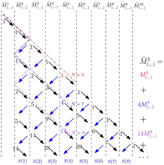 Numbers near vertices of the lattice are the coefficients in Figure 12. Blue arrows denote steps in the recursion, which were added by the long steps in the lattice path model. Length of paths N, descending to a considered vertex of a lattice gives the number of the strip in the auxiliary lattice path model, the multiplicity function of which is being added to (32) as a term. As an example, we show formula for .