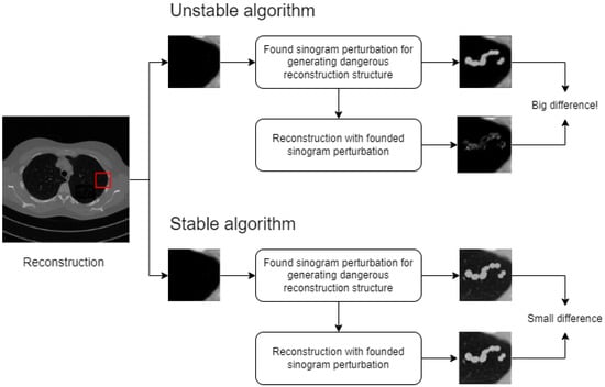 Inaccuracies or artifacts in reconstruction can lead to misdiagnosis. Classical algorithms (FBP, SIRT) produce well-known reconstruction artifacts []. These artifacts include metal-like [], limited angle [] artifacts, etc. Since the morphology of such artifacts is well known, their detection by specialists is not a problem. Thus, such artifacts may require only additional measurements in most cases. On the other hand, NN algorithms produce reconstruction artifacts that can be indistinguishable when the results are compared to the correct reconstructions []. The general scheme of difference between robust and not robust algorithms is demonstrated in Figure 1. Therefore, such artifacts may not be detected by a specialist. Thus, NN non-robustness can lead to misdiagnosis when using CT reconstruction exclusively. Such artifacts were shown in [], where the NN algorithm [] did not restore the reconstruction details characteristic of cancerous tumors by introducing insignificant noise to projections.