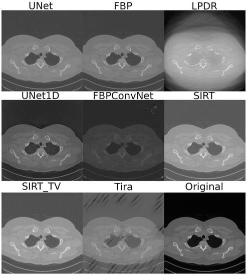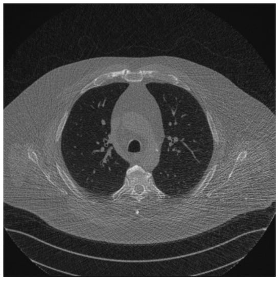 The NN algorithms for CT reconstruction were trained and their robustness was evaluated for the open dataset of medical tomography data “Low Dose CT Grand Challenge” [,,]. The dataset comprises 99 head scans, 100 chest scans, and 100 abdomen scans, which were measured by Siemens and General Eclectic CT-scanners. The pixel width and height of each slice is 512. The example of chest reconstruction is shown in Figure 3.