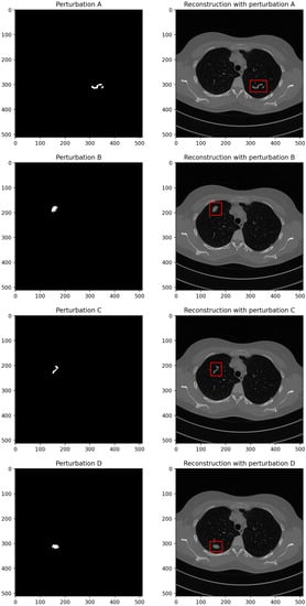 Based on the medical atlas [], four reconstruction perturbations (pathologies) for the reconstructed images were formed. The perturbations corresponded to the airway involution and obstruction. These four perturbations were added to reconstructed images to construct ground truth for the L-BFGS algorithm. In (10), these perturbations are . Perturbations and examples of their addition to the reconstructed image are shown in Figure 5. Simulated perturbations are binary masks without internal structure and these perturbations are placed in different parts of the lungs and have different shapes and sizes. These specific pathologies are relatively small and have simple inner structure; hence, they were chosen for the simulation. The localization of the simulated perturbations allows for a minimal distortion of the sinogram to ensure reproducibility. Images A and C show resuscitation and obstruction of the airways. This may be the sole sign of infection, typical for a viral one, such as in this example of a patient with a rhinovirus infection. Images B and D show asymmetric central bronchiectasis and mucoid occlusion, which is characteristic of allergic bronchopulmonary aspergillosis and tuberculosis. When calculating our task-oriented robustness score (11), these reconstruction perturbations acted as .