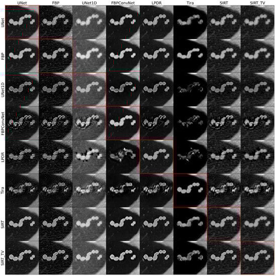 Table 2 and Table 3 illustrate that FBP and SIRT algorithms are the most robust algorithms. On the other hand, ResUnet is the most robust neural reconstruction algorithm among all tested algorithms. For a visual assessment of the robustness for these algorithms, we calculated corresponding reconstructions (see Figure 7). Figure 7 is structured as follows. Each row shows reconstructions by the algorithm as indicated by the row label. The input of these reconstruction algorithms is the perturbed sinograms calculated by Formula (10) for algorithms which are indicated by the column label. Hence, we can observe the perturbations which are specific for certain reconstruction algorithms in terms of other reconstruction algorithms. The perturbed sinograms acquired by non-robust algorithms and used as input for other reconstruction algorithms produce reconstructions that are very different compared to the ideal one.