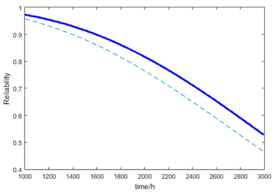 Then, the point estimation (solid line in Figure 3) curve of the reliability under the Weibull distribution is obtained.