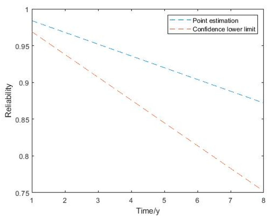 With the GPS receiver data, we can obtain the reliability point estimation and remaining samples . Set the confidence level to be . Finally, the reliability point estimation and lower confidence limit of GPS receiver for 1 to 8 years are calculated in Figure 6.