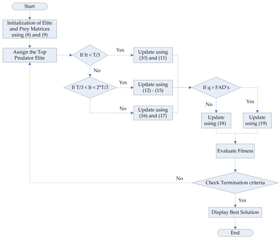 The MPA is a population-based metaheuristic inspired from the behavior of predators when catching prey [59]. It utilizes Brownian and Levy movement for the optimal interaction between predator and prey. Its mathematical model, pseudocode, and algorithm flowchart are presented below.