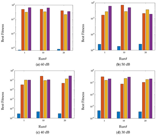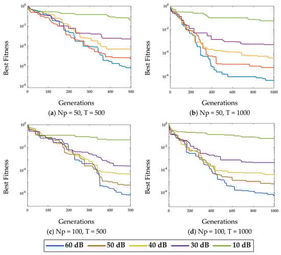 It is noted from the fitness plots demonstrated in Figure 4a–d that for a fixed population size and number of generations, the fitness achieved by MPA for a low level of noise, i.e., [60 dB], is quite a lot less compared with the fitness for a high noise level, i.e., [50 dB, 40 dB, 30 dB, 10 dB]. Yet, MPA achieves the minimum value of fitness for the smallest value of noise, i.e., [60 dB] for Np = 100 and T = 1000. Therefore, it is confirmed from the curves in Figure 4 that the performance of MPA is lower for higher noise values.