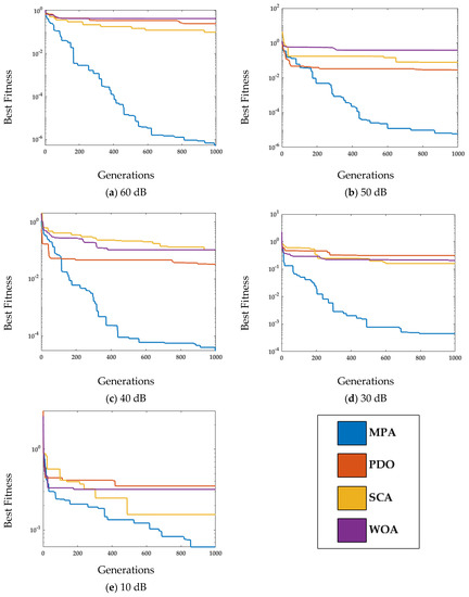 Figure 5a–e demonstrates the convergence of MPA with SCA, WOA, and PDO at Np = 100 and T = 1000 over all of the noise levels, i.e., [60 dB, 50 dB, 40 dB, 30 dB, 10 dB]. It is noted from Figure 5a–e that with the increase in noise level, the fitness value also increases. However, MPA achieves the lowest fitness compared with SCA, WOA, and PDO for all of the noise levels.