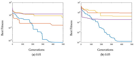 The input data are generated in the same way as mentioned in case study 1, while the noise in the ARX model is taken as white Gaussian with constant variance, i.e., [0.01, 0.05, 0.10]. Two variations of generation (T) [500, 1000] and population Np = 50 are considered. The fitness for case study 2 is calculated through (20) by using y instead of , and the fitness plots are demonstrated in Figure 8.