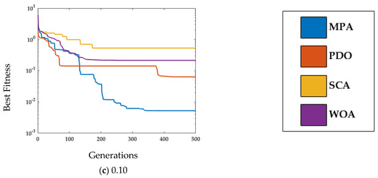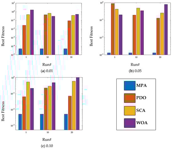 Figure 10a–c demonstrates the convergence of MPA with SCA, WOA, and PDO at Np = 50 and T = 500 over all the noise levels, i.e., [0.01,0.05,0.10]. It is noted from Figure 10a–c that with the increase in noise level, the fitness value also increases. However, MPA achieves the lowest fitness compared with SCA, WOA, and PDO for all of the noise levels.