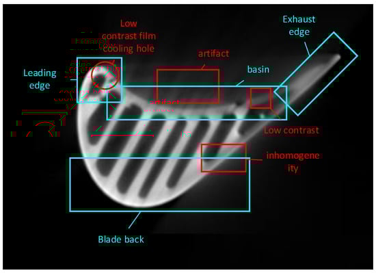 However, due to the hollow turbine blade’s complex structure and special material properties, the industrial computed tomography (ICT) images contain blurred and low-contrast small structures whose precise contours are hard to extract [7], which greatly affects their ICT detection accuracy, as shown in Figure 1. Typically, there are two ways to solve this problem: (1) improve the ICT image quality and (2) increase the precision of image segmentation methods. The first approach requires better hardware of X-ray source, flat panel detector, etc., which is expensive and laborious. Therefore, many efforts have been made to increase the segmentation accuracy of the turbine blade.