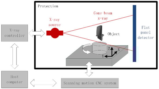 The schematic diagram of the ICT scanning system is shown in Figure 2. The workpiece to be detected is placed on the rotary table controlled by the computer numerical control (CNC) system. Then the X-ray source projects an X-ray to penetrate the workpiece and leaves a projection on the flat panel detector. By rotating the workpiece at 360 degrees, the projection data of the workpiece in all directions can be obtained. After that, the ICT reconstruction algorithm is used to obtain the CT slice images of the workpiece.