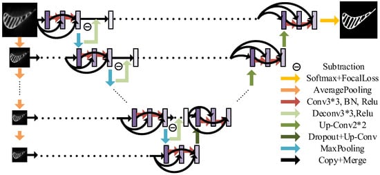 The traditional U-net is an end-to-end encoder–decoder-based image semantic segmentation network, which is mainly composed of the encoder, the decoder, and the jump connection. The architecture of the U-net resembles a capital “U” letter, which is a symmetrical network with an encoder on the left and the decoder on the right. The encoder is mainly used to extract the image’s features, location, semantics, and other information, which is composed of several groups of “convolution + batchnormalization + Relu” operations followed by “Maxpooling” to realize the nonlinear expression capability of the network. Unlike the encoder, the decoder is used for up-sampling, restoring, and decoding the learned abstract semantic features via up-convolution operations to recover the image’s semantic information gradually. The input of each decoder layer is fused with the features of the corresponding ender layer through a jump connection to obtain enough image features at different scales. A 1*1 convolution operation will connect the output of the decoder and Softmax operation to map feature maps learned by the U-net network to the number of categories that need to be divided. Then each pixel in the original image is classified according to the probability value generated by the U-net network. Compared with conventional fully convolutional networks, the U-net network performs well in dealing with image contour segmentation due to the deep multiscale fusion of high-level and low-level features through skip connection operations.