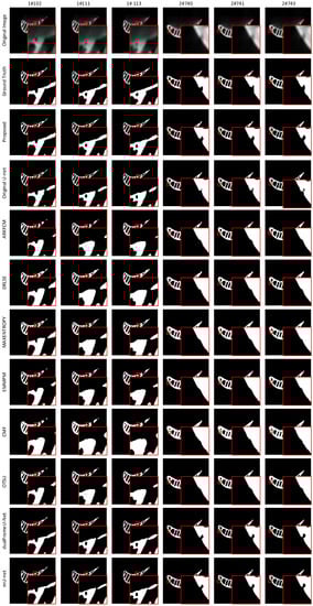 It can be known from Figure 6 that our proposed approach realized the best segmentation results compared with mathematical model-based segmentation methods and other U-net architectures. The ARKFCM method failed to segment the low contrast detail in the basin and the exhaust edge of both hollow turbine blades. In addition, small film cooling holes in the leading edges were also not segmented. For the DRLSE method, the target pixels on the edge of the hollow turbine blade are more likely to be mistakenly identified as the background, resulting in a certain dilation of the entire target object compared to the ground truth. Compared with the DRLSE method, the object dilation caused by this mis-segmentation is more obvious in the CMF method. Excessive dilation can cause severe deformation of the target, affecting the accuracy of subsequent measurements and registrations of the workpiece. Furthermore, the CMF method also failed in segmenting details in the blade basin and exhaust edge, as well as small film cooling holes scattered in the blade’s leading edge. The segmentation results of the EM/MPM and the MAXENTROPY methods were also ineffective, i.e., dilated edges, lack of details in low-contrast blade basin, and not segmented film cooling holes all appeared in both hollow turbine blades. For the Otsu method, the main issue was that the accuracy was not high, i.e., the edge details and film cooling holes were not successfully identified.