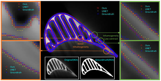 To study the robustness of the proposed approach, this paper evaluated it on sample 1#268 with severe inhomogeneity, noise, and low contrast. The comparison results with conventional U-net are depicted in Figure 7.