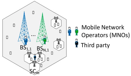 Along with the traditional macro network, we consider one tier of SCs in the same geographical area. Each SC can be a Wi-Fi node or a femtocell that operates in a separate channel, and hence does not interfere with the macro cells [32]. Each SC is represented as , where . We assume that the M SCs are randomly distributed in the area, where hotspot traffic is observed. The SCs are deployed by third parties. The network configuration adopted in this work is illustrated in Figure 1.